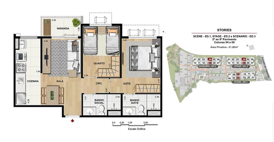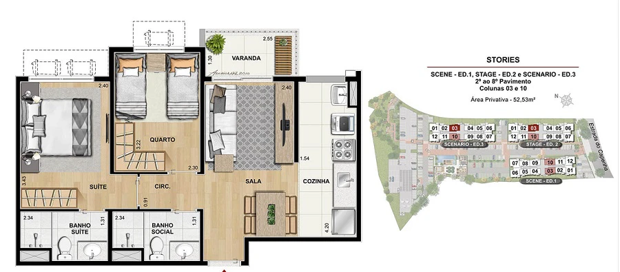 Apartamentos de 2 quartos com 52m².