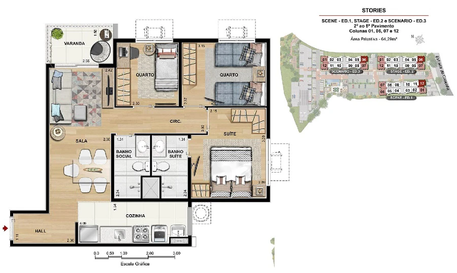 Apartamentos de 3 quartos com 64m²