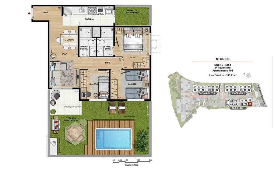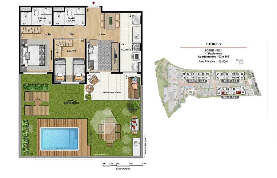 Apartamento garden de 3 quartos, com 68m² até 105m²;