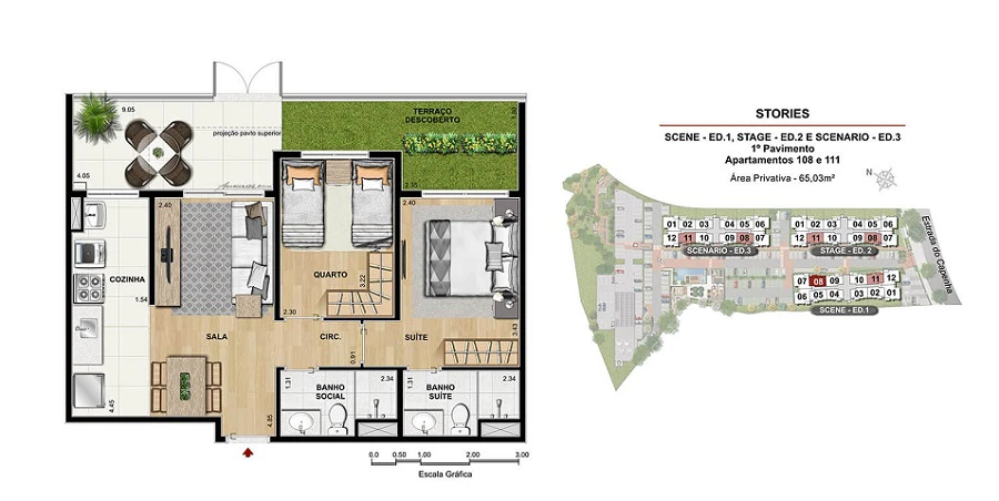 Apartamento garden de 2 quartos com 65m² até 113m²;